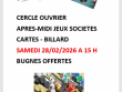 APRES-MIDI JEUX SOCIETES - CARTES -BILLARD -CERCLE OUVRIER CERCLE OUVRIER APRES-MIDI JEUX SOCIETES CARTES -BILLARD SAMEDI 28/02/2026 A 15 H 00 BUGNES OFFERTES |